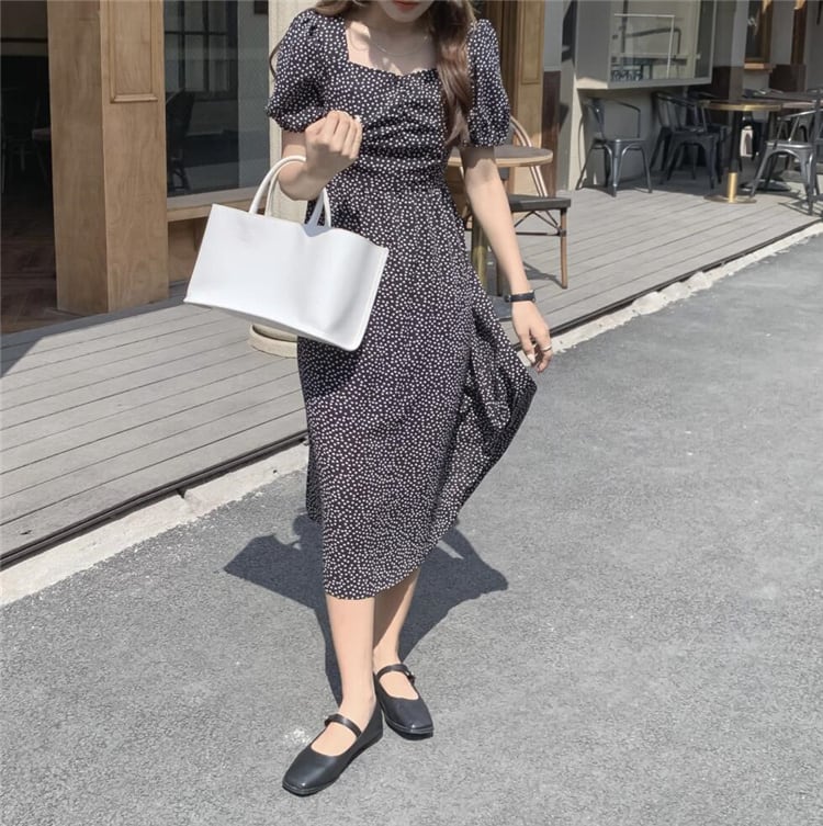 INSスタイル プリント ワンピース 夏 ウエストを収める 半袖 蝶結び Aラインスカート