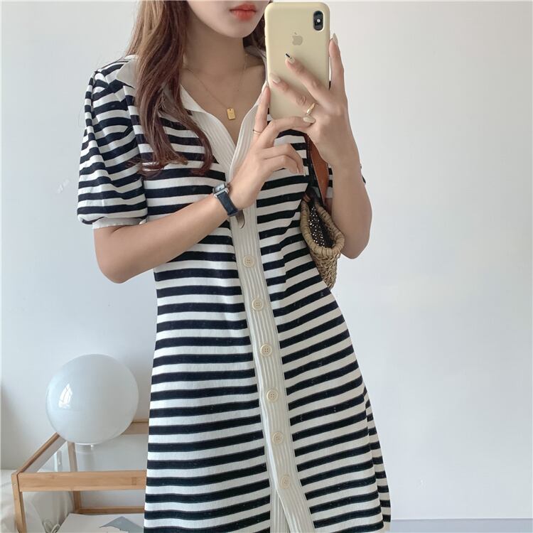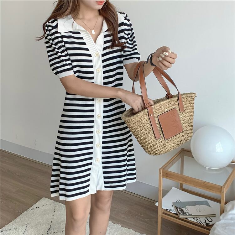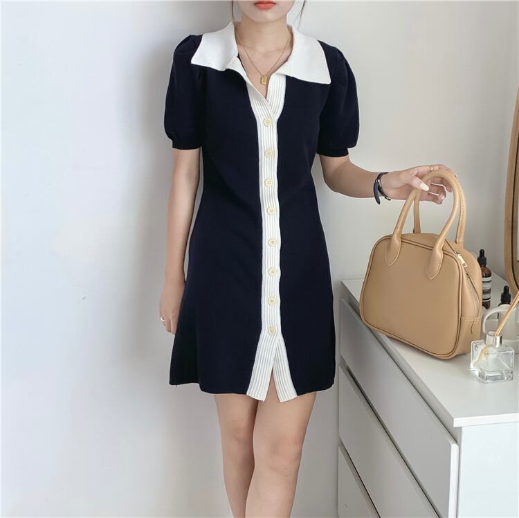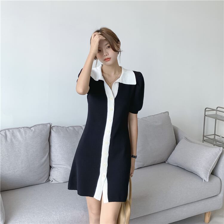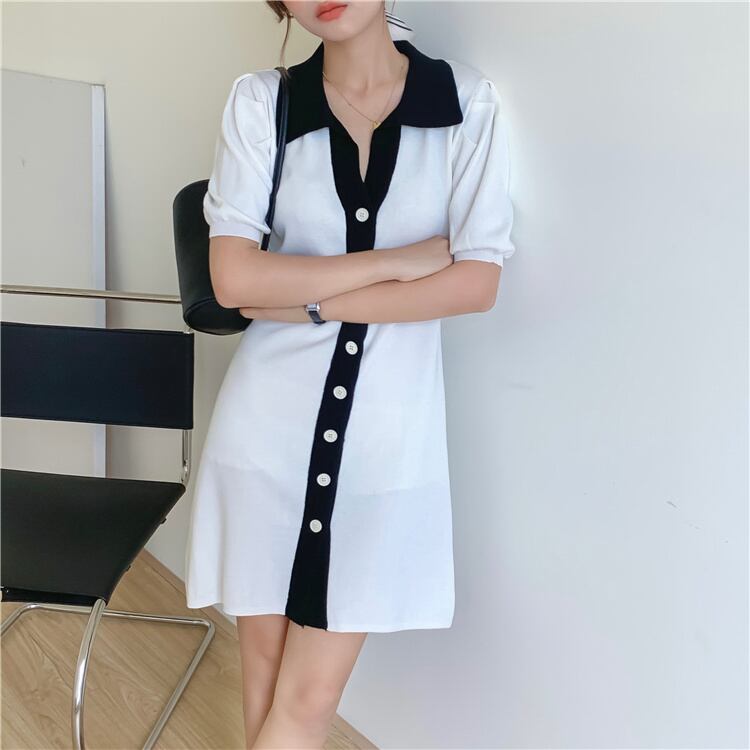 通勤する 気質 カラーマッチング 半袖 POLOネック ニット 単体ボタン Aライン ワンピース 女性 スリム