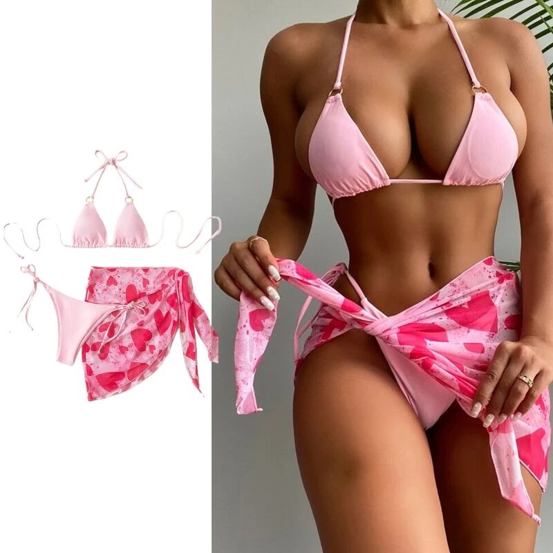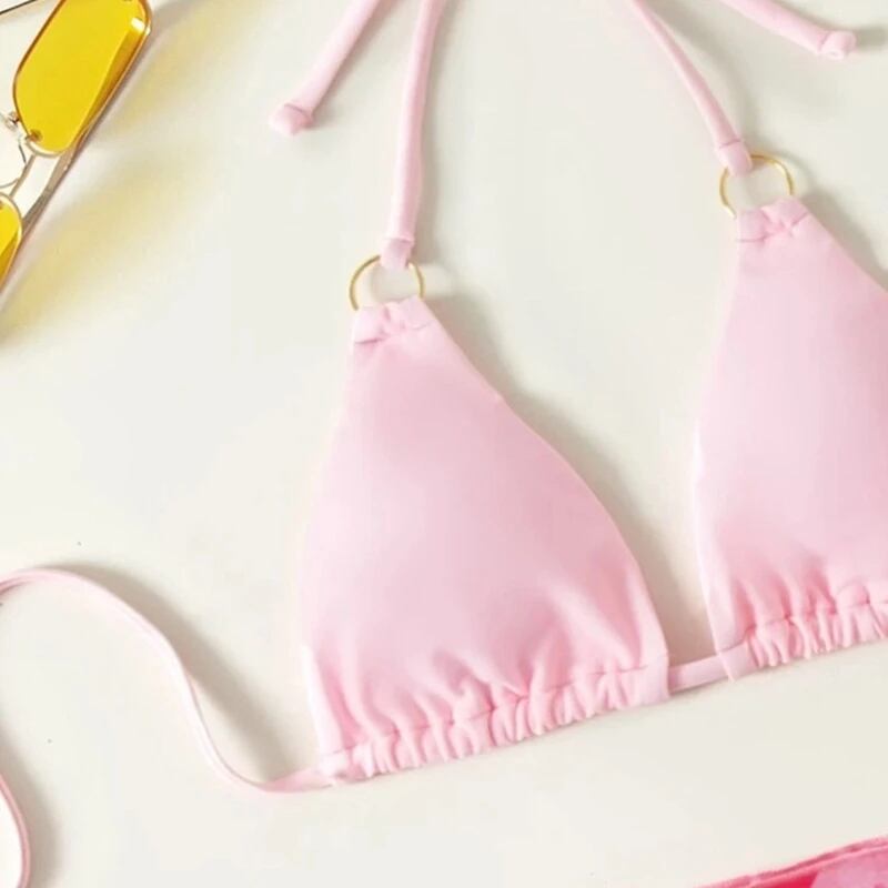 女性用3ピースホルタービキニ,ピンク,ミッドウエスト,ホルター,レースアップ,調節可能,セクシー,トライアングル,レディース水着 ビキニ Tシャツ T240619000737_01 | OPEN-korea