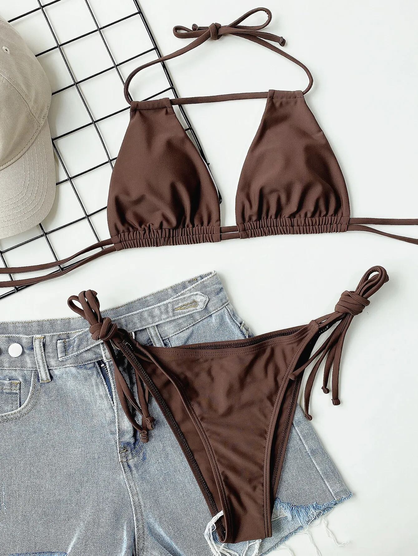 女性のためのセクシーなマイクロビキニセット,茶色のひも,ホルターネック,レースアップの水着,透かし彫りの水着,水着,2023 ビキニ Tシャツ T240619000951_01 | OPEN-korea