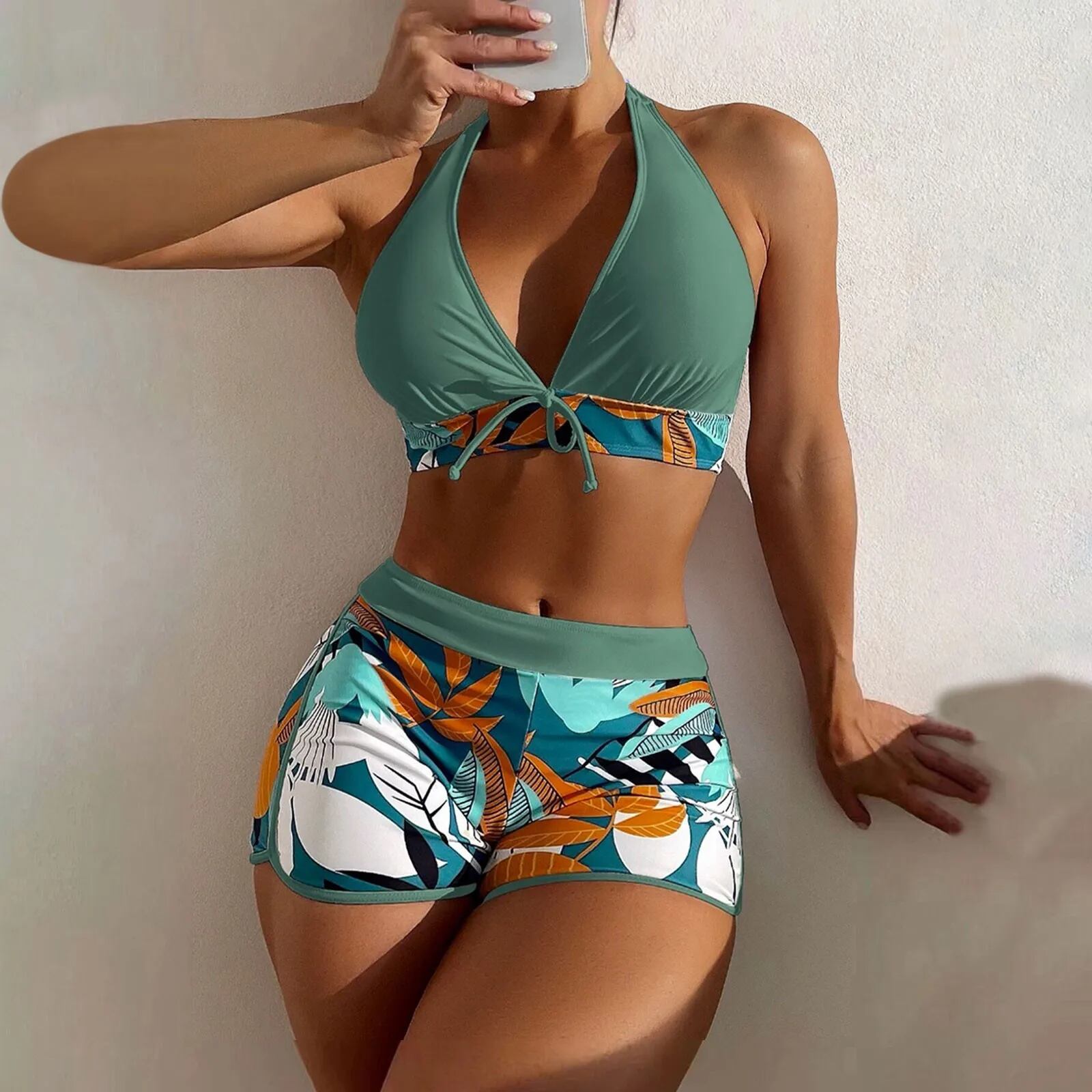 ツーピースの女性用プリント水着,レトロなスタイルの水着,フレッシュリーフプリントのトリムがセットされたハイウエスト ビキニ Tシャツ T240619001201_11