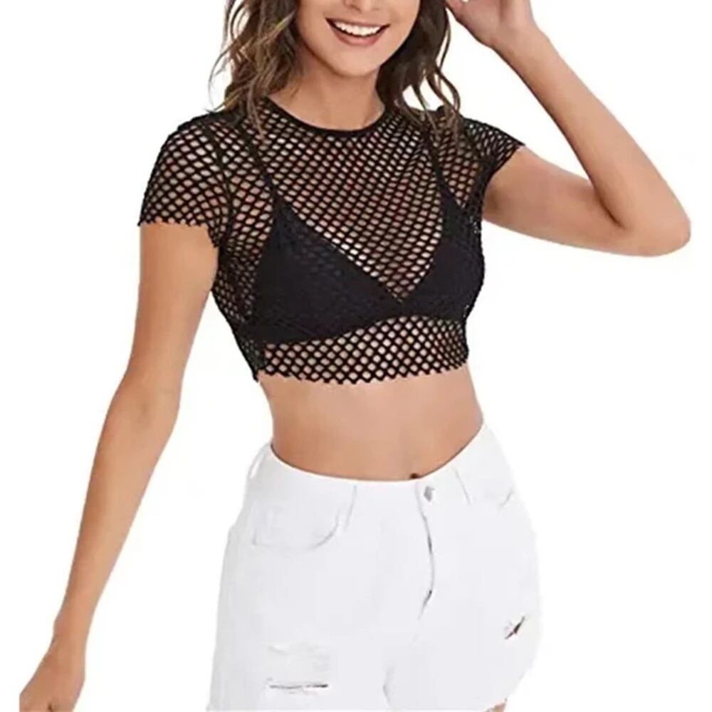 女性用半袖Tシャツ,透明メッシュ,黒,白,緑,透かし彫り,ショートトップ ボトム ボトムス ズボン T240619134801_03