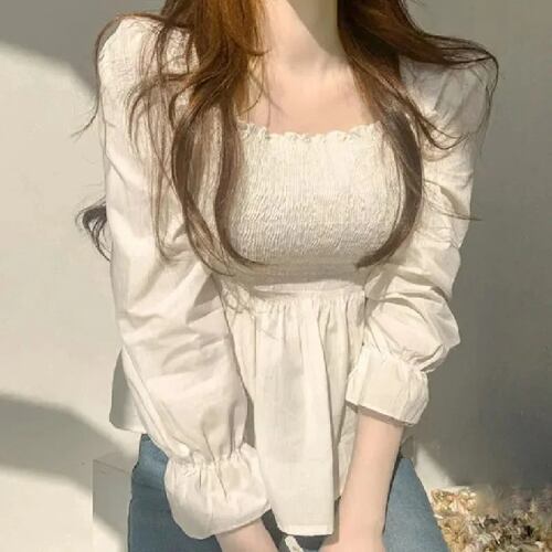 女性用スクエアネックスリムシャツ,エレガントな白いブラウス,長袖トップス,オフィスファッション,新しいコレクション8023