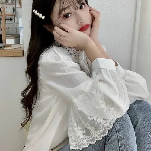 ファッション韓国のレースアップフリルブラウス女性秋のルース服collat女性はヴィンテージレースのシャツ女性11335