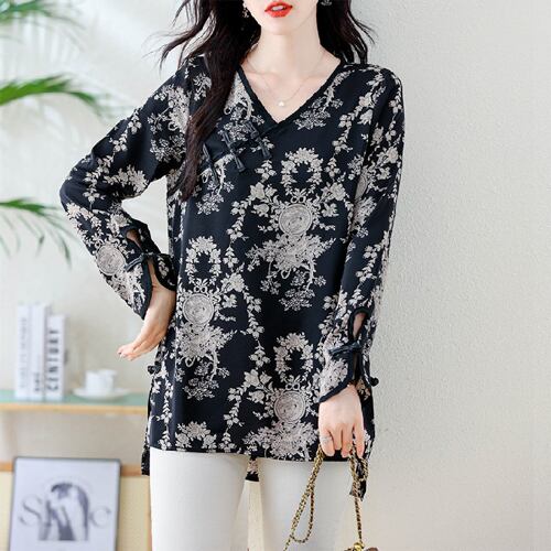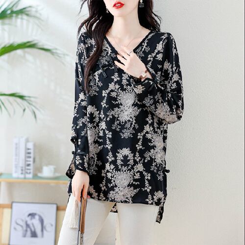 初回送料無料 新作レディースファッション プリント アンバランス vネックシャツ トップス