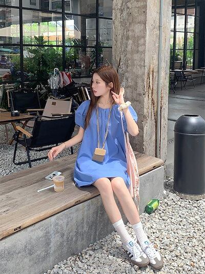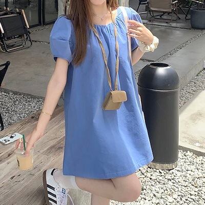 2024 春夏ワンピース 半袖 ミニ丈 Aライン ラウンドネック ゆったり 細見え 夏 青 ブルー シンプル おしゃれ かわいい 無地 韓国ファッション レディース お出かけ | OPEN-korea
