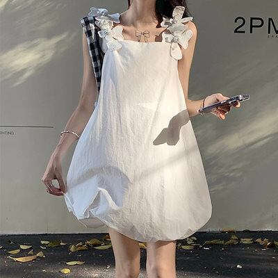 2024春夏ワンピース ノースリーブ スクエアネック ミニ丈 Aライン 花 ゆったり 細見え 夏 白 ホワイト おしゃれ かわいい 甘め キュート ラブリー 韓国ファッション レディース お出かけ | OPEN-korea