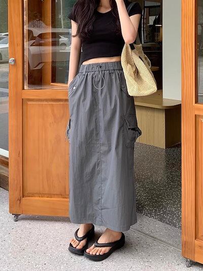 2024 春夏スカート ロング丈 ポケット スリット バックオープン ハイウエスト 美脚効果 脚長効果 細見え 夏 おしゃれ かわいい 韓国ファッション レディース お出かけ | OPEN-korea