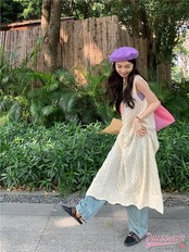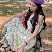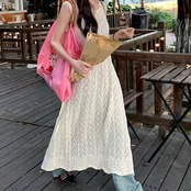 ワンピース ミモレ丈 ジャンパースカート ジャンスカ ノースリーブ Aライン レース 透かし彫り スリット バックオープン 白 ホワイト 春 韓国ファッション レディース おしゃれ かわいい カジュア | OPEN-korea