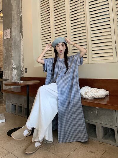 2024 春夏ワンピース シャツ ギンガムチェック柄 ラウンドネック 半袖 ボタン ミモレ丈 Aライン ゆったり 細見え 夏 青 ブルー カジュアル おしゃれ かわいい 韓国ファッション レディース | OPEN-korea