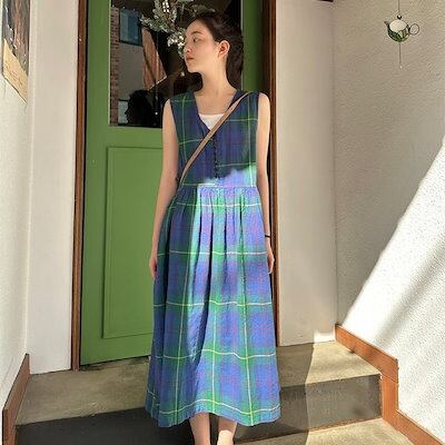2024夏 韓国セットアップ ジャンパースカート ジャンスカ ミモレ丈 Vネック ノースリーブ Aライン チェック柄 ゆったり 細見え 夏 青 緑 おしゃれ かわいい 韓国ファッション レディース お | OPEN-korea