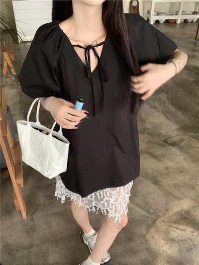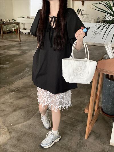 2024 春夏ワンピース 膝丈 レース Vネック 半袖 Aライン ゆったり 細見え 夏 黒 ブラック カジュアル おしゃれ かわいい キュート 韓国ファッション レディース お出かけ | OPEN-korea