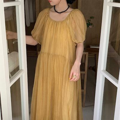 2024 春夏ワンピース ロング丈 半袖 バブル袖 バックオープン Aライン リボン ゆったり 細見え 夏 黄色 カジュアル おしゃれ かわいい キュート 韓国ファッション レディース お出かけ | OPEN-korea