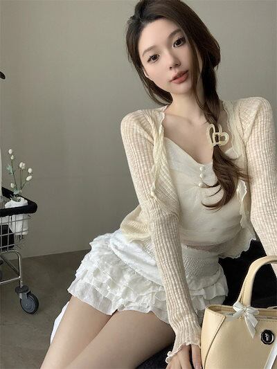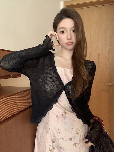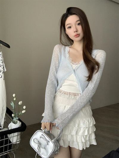2024 夏 韓国 ショート丈 薄手 カーディガン トップス 長袖 紫外線対策 UV対策 羽織り加工 きれいめ ライトニット オフィス OLネックカジュアルフレンチフェミニンファッション韓国レディース | OPEN-korea