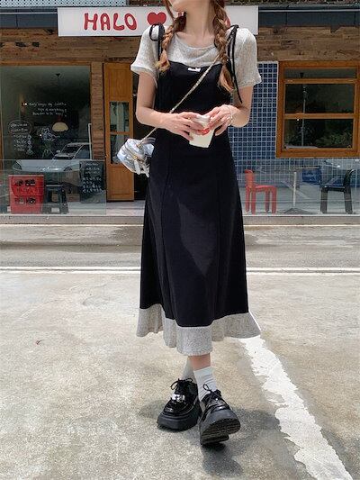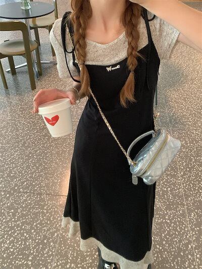 2024 春夏ワンピース ミディアム丈 2枚重ね風 半袖 キャミソール ラウンドネック Aライン リボン ゆったり 細見え 夏 カジュアル おしゃれ かわいい キュート 韓国ファッション レディース | OPEN-korea