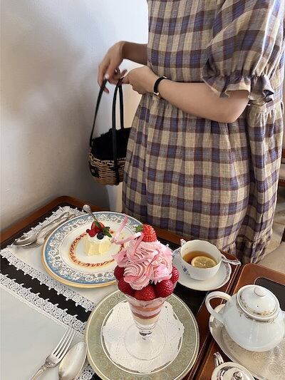 2024 夏 韓国ワンピース ロング丈 レトロ ラウンドネック 半袖 バブル袖 チェック柄 Aライン ゆったり 細見え 夏 紫 パープル カジュアル おしゃれ かわいい キュート 韓国ファッション レ | OPEN-korea