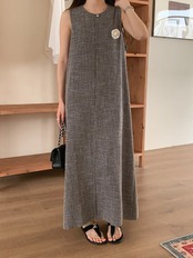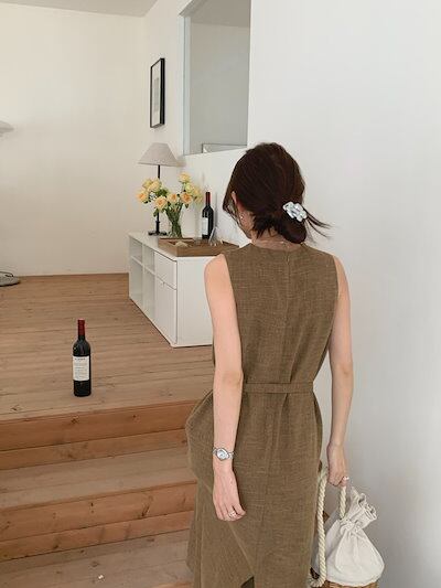 2024 春夏ワンピース ロング丈 ラウンドネック ノースリーブ Aライン リボン ベルト ゆったり 細見え 夏 茶色 きれいめ おしゃれ かわいい キュート 韓国ファッション レディース お出かけ | OPEN-korea