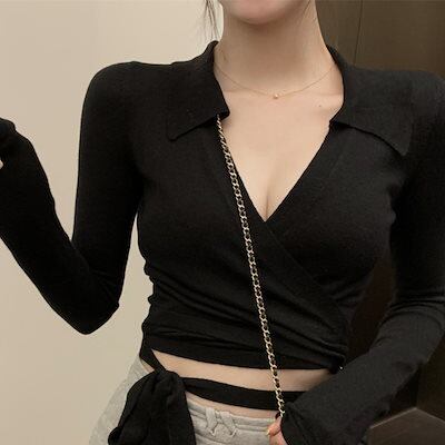 2024 ファッション 長袖 デザイン感セーター セクシーvネックバンド レディース ベーシックニットトップス