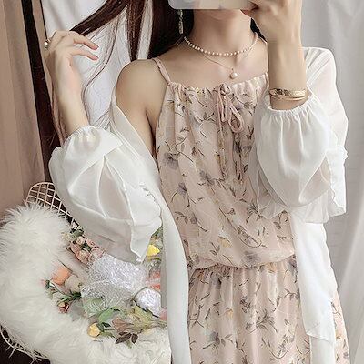 花柄シフォンワンピース サンブレラ シフォン カーディガン 2点セットノースリワンピ ビーチホリデーキャミ ワンピース