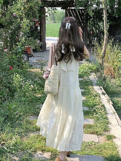 レースのネックラインのドレス 女性の夏2024新しいノースリワンピ 気質ノースリーブストラップレスビッグスイングキャミソール ワンピース