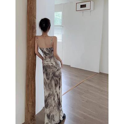 新作水墨画ホルタードレス 女性の春フレンチスリムストラップレスキャミ ワンピース 気質スカートパッケージヒップフィッシュテールワンピース