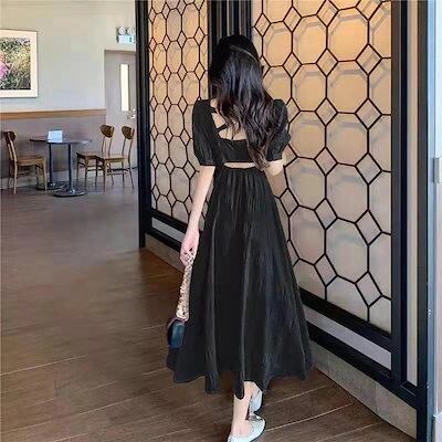 新しい フランス 甘い ワンピース 可愛い バブル袖 背中を見せる 半袖ワンピース【長い/短い】