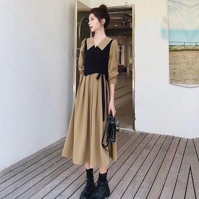 フレンチヴィンテージ ワンピース レディースファッション ェイクレイヤード 長袖ワンピース