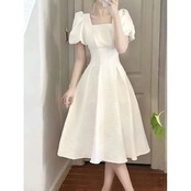 ホワイト バブル袖ワンピース レディース 着痩せ フランス ウエスト引き締め スリム見え スクエアネック ロングドレス