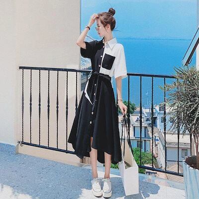おしゃれ コントラストカラー ワンピース 着痩せ レディース ウエスト引き締め スリム見え イレギュラー 半袖 ロングドレス