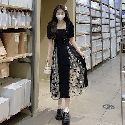 レトロ メッシュ 切り替え 半袖ワンピース 着痩せ サマー 新しい スクエアネック ウエスト引き締め Aラインワンピース