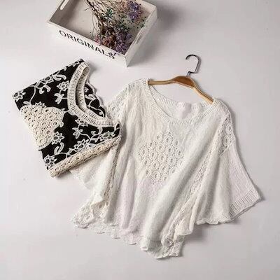 2024 春夏シャツ レース ブラウス レディース トップス 着痩せ 半袖 プルオーバー 花柄 透かし編み シースルー 透け感 綿 コットン 無地 ホワイト ブ ブラウス 韓国ファッション | OPEN-korea