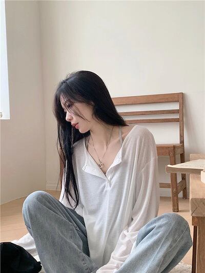 2024春夏 トップス 長袖 レイヤード風 キャミソール tシャツ 着痩せ 重ね着風 カットソー インナー ショート長袖 タイトサイズ フィット T カジュアルシルエット きれいめ ネック | OPEN-korea
