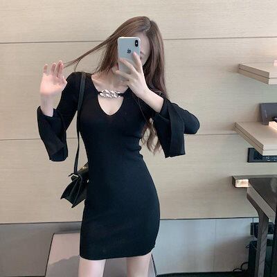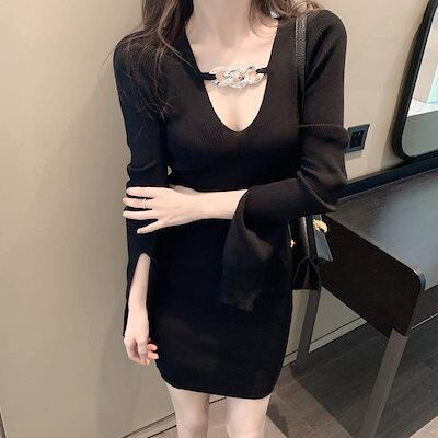 秋新作 Vネックワンピース スリミング 長袖 着痩せ ニットワンピース セクシー タイトスカート