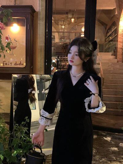ブラック Vネック ロングドレス レース切り替え 着痩せ ワンピース セクシー ウエスト引き締め スリット マーメイドスカート