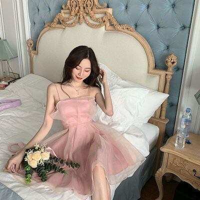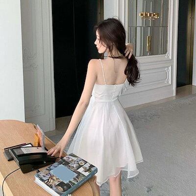 フランス フェイクレイヤード キャミソールワンピース レディース ウエスト引き締め Aライン ドレス