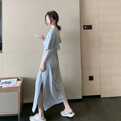 ワンピース 夏新作 ウエスト引き締め 着痩せ ロングドレス 背中を見せる スリット 半袖ワンピ Tシャツワンピース
