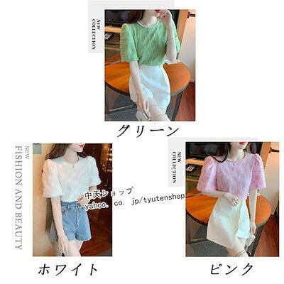 ブラウス レディース 半袖tシャツ 夏秋新作 パフスリーブブラウス トップス 丸首 着痩せ キレイめ 韓国風 おしゃれ レース 切り替え ブラウス カジュアル