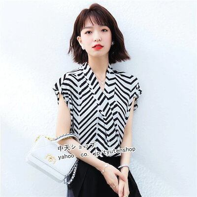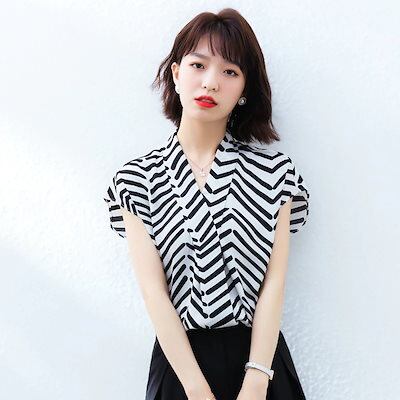 ブラウス レディース シャツブラウス シフォンブラウス トップス vネック 半袖 柄 ストライプス おしゃれ 着痩せ シャツ シンプ ビジネス オフィス 大人