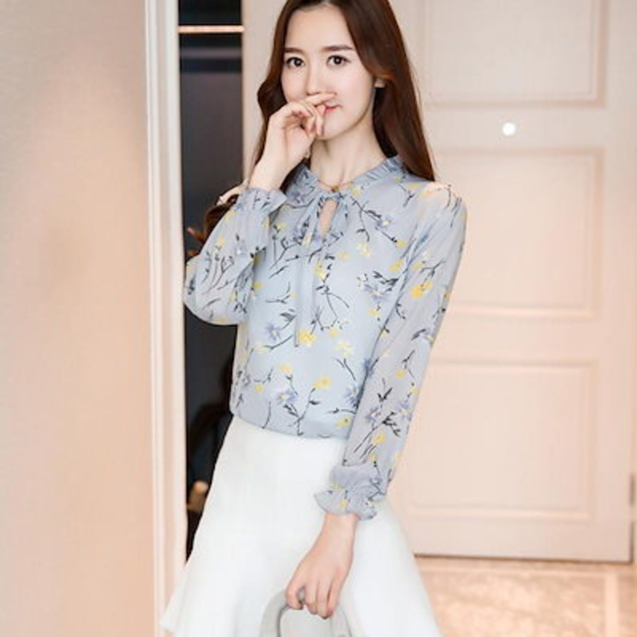 新入荷 ブラウス レディース シャツ 長袖 花柄 シフォン パフスリーブ フラワー ゆったり 着痩せ 普段着 通勤 OL 春秋 可愛い