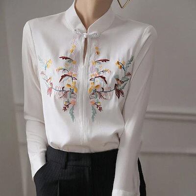 刺繍 ブラウス チャイナボタン 春 秋 長袖 マオカラー 上品 エレガント 立ち襟 シャツ レディース スタンドカラー きれいめ トップス 白 黒 お