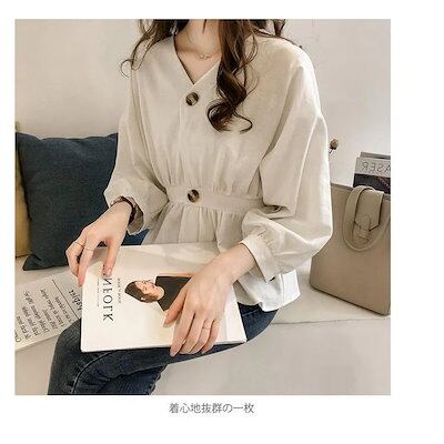 長袖ブラウス レディース 綿混 ブラウス Vネック 鎖骨見せ 大人 エレガント ナチュラル 上品 普段着 お洒落 フレアブラス ウェスト締める