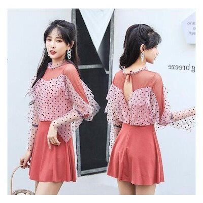 高級な質感 水着レディース 体型カバー ワンピース型 スカート付き ハイネック 日除け長袖 オールインワン フレア 可愛い 20代 30代 40代