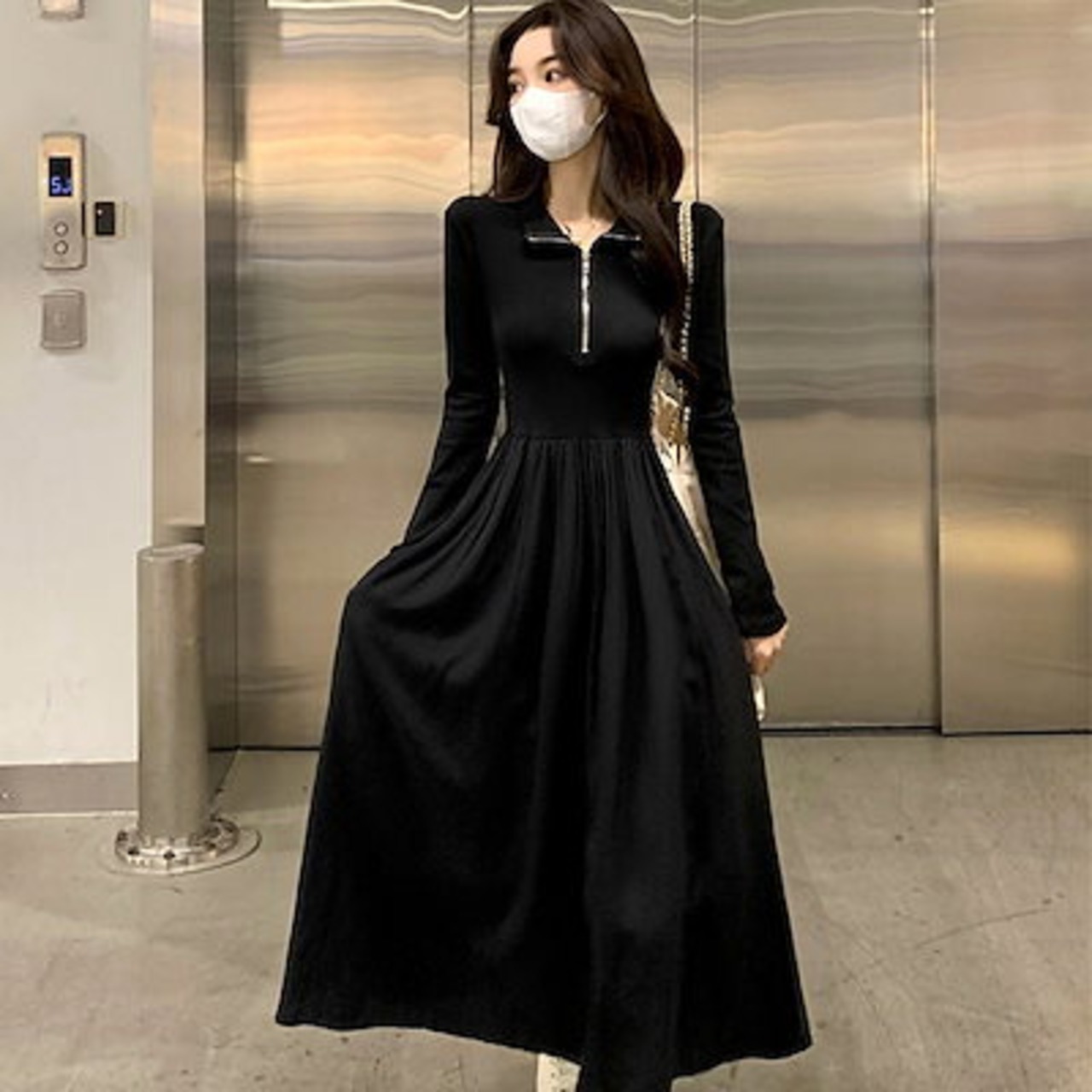 長袖ワンピース レディース 2024 新作 ハーフジップデザイン ウエスト細 ミドル丈スカート