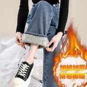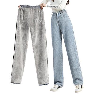裏起毛デニムパンツ ワイドレッグジーンズレディース2024秋冬新作カジュアルルーズハイウエストストレートパンツ