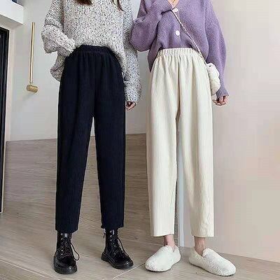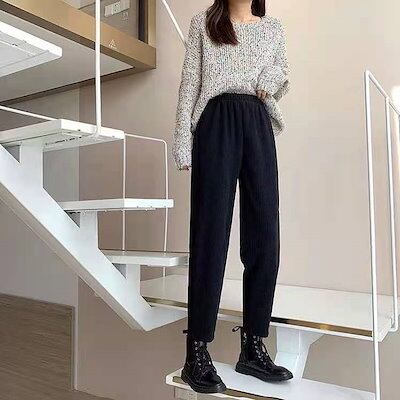 テーパードパンツ コーデュロイパンツ女性春新作ルーズストレートパンツハイウエスト黒9分丈パンツ