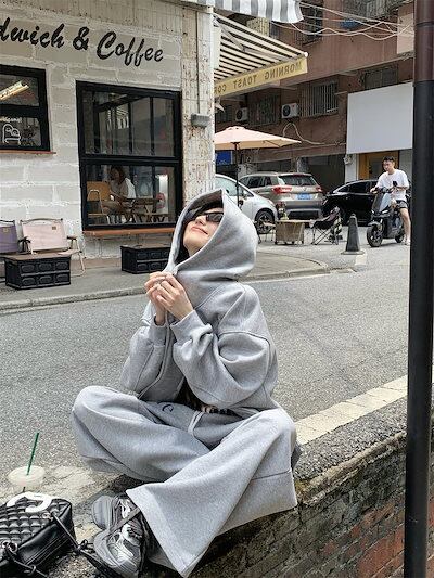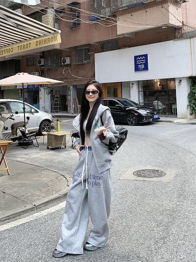 2024 春秋 2点セット トップス お出かけ 羽織り ショート丈 セットアップ フルラウンドヘム ルーズ サイド ボトムス ストレート系冬 ゆったり サイズワイドシルエット リラックストラック | OPEN-korea