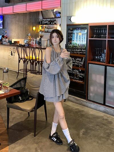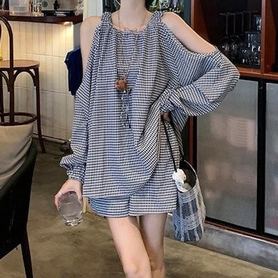 2024秋冬セットアップ トップス シャツ ラウンドネック ギンガムチェック オープンショルダー ショートパンツ ワイド ゆったり 秋 黒 ブラック おしゃれ かわいい 韓国ファッション レディース | OPEN-korea