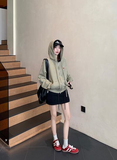 2024 秋冬アウター パーカー フード付き ジップ チャック 長袖 花柄 ポケット ハート 細見え 秋 緑 カーキ おしゃれ かわいい ガーリー キュート 甘め 韓国ファッション レディース お出か | OPEN-korea