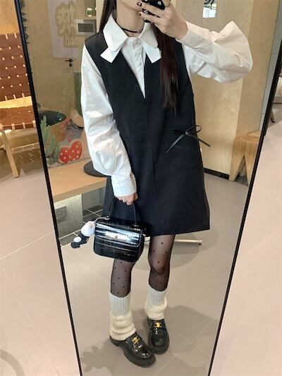 2024秋冬2点セット ワンピース ミニ丈 ジャンパースカート ジャンスカ Vネック リボン トップス シャツ 長袖 秋 白 黒 おしゃれ かわいい 韓国ファッション レディース お出かけ | OPEN-korea