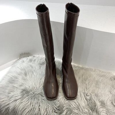 スクエアトゥ ロング ブーツ ブーティー ミッドヒール厚底 レザー シンプル ハイヒールブーツ レディース ロングブーツ